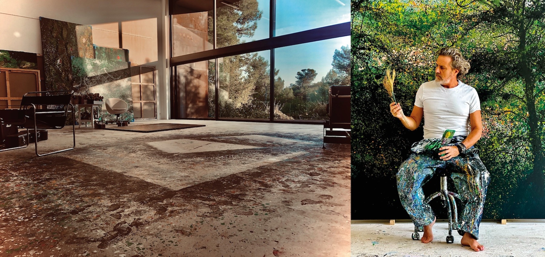 Pour l’artiste, l’arbre n’est pas un simple motif. Il est langage. Il incarne le lien entre le ciel et la terre, entre le geste humain et les forces invisibles du monde. Dans ses premières œuvres de la série « Between the Lines », on trouve l’empreinte du végétal, sa peau érodée, sa fragili- té révélée par le dripping ou la coulure. En 2020, lors d’un voyage dans les jardins de Claude Monet, l’artiste réalise la série « Voyage à Giverny », où la nature se dévoile sous le prisme de cette immersion picturale. Cette expérience donnera lieu à une exposition muséale la même année. Vient ensuite « The Forest Call », une série où l’arbre devient symbole, forme à la lisière de la figuration et de l’abstraction, comme une présence intérieure et sensible. Enfin, dans « Arborescences » et « Lisière » l’arbre devient outil : des branches sont transformées en pin- ceaux, des cendres sont mêlées à la peinture, offrant à l’artiste une matière vivante, symbole de transformation, de mémoire et de résilience.